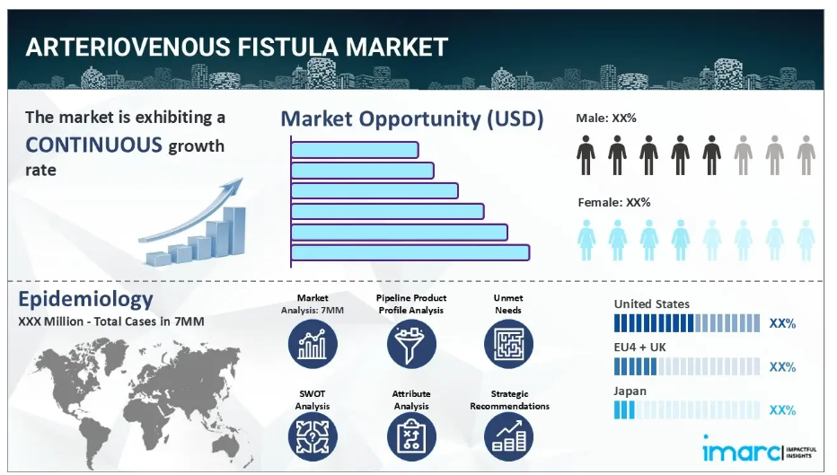 IMARC Groupの新たなレポートは、米国、EU4(ドイツ、スペイン、イタリア、フランス)、英国、および日本における動静脈瘻市場について包括的な分析を提供します。これには、治療実践、市場流通中および開発中の薬剤、個別療法のシェア、7大市場における市場動向、主要企業とその薬剤の市場実績などが含まれます。