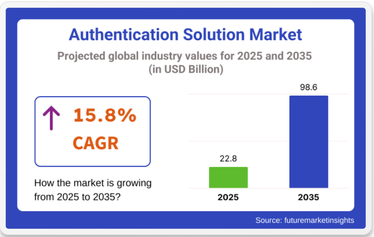 認証ソリューションの世界的な売上高は、2025年に228億米ドルに達すると推定され、2035年までに986億米ドルに達すると予測されており、予測期間中に15.8%の年平均成長率(CAGR)で拡大する見込みです。