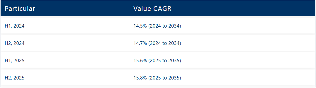 その後、2025年上半期から2035年下半期にかけて、CAGRは上半期に15.6%へわずかに上昇し、下半期には15.8%と比較的緩やかな伸びを維持すると予測される。上半期には20ベーシスポイント(BPS)の減少が見られた一方、下半期には20ベーシスポイント(BPS)の増加が確認された。