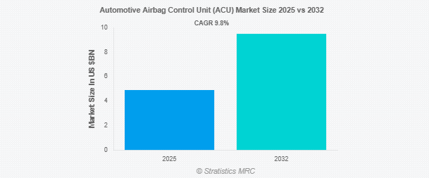 Stratistics MRCによると、自動車用エアバッグコントロールユニット(ACU)の世界市場は2025年に49億ドルを占め、予測期間中の年平均成長率は9.8%で、2032年には95億ドルに達する見込みです。自動車用エアバッグ・コントロール・ユニット(ACU)は、衝突を検知してエアバッグを展開し、乗員を保護する電子モジュールです。ACUは、加速度計や衝撃検知器などのセンサーを常時監視し、衝突の程度や性質を評価します。衝突があらかじめ設定されたしきい値を超えると、ACUは数ミリ秒以内にエアバッグを膨らませ、乗員の安全性を高めます。また、診断機能を管理し、誤作動を防止することで、事故時の確実な作動を保証します。