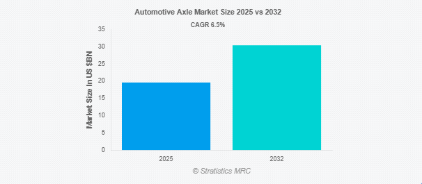 Stratistics MRCによると、自動車用アクスルの世界市場は2025年に196億ドルを占め、予測期間中の年平均成長率は6.5%で、2032年には304億ドルに達する見込みです。自動車用アクスルは、車両の重量を支え、車輪を駆動機構に接続する重要な機械部品です。構造的なアライメントと安定性を維持しながら、エンジンから車輪への動力伝達を容易にします。アクスルにはフロントタイプ、リアタイプ、スタブタイプがあり、駆動方式(FF、FR、AWD)によって構成が異なります。車両が軽量化や電動化に向けて進化するにつれ、アクスルは高トルク伝達、耐久性、ブレーキ、サスペンション、ドライブトレインシステムとの統合を目的に設計されることが多くなっています。