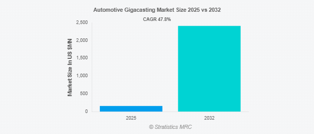 Stratistics MRCによると、自動車用ギガキャスティングの世界市場は2025年に1億5,640万ドルを占め、予測期間中の年平均成長率は47.8%で、2032年には2億4,098万ドルに達する見込みです。自動車用ギガキャスティングは、高圧ダイカスト技術を使用して自動車部品を大規模に生産するプロセスです。構造要素や車体部分などの大型部品を一体鋳造します。このプロセスは、自動車の部品点数を大幅に削減し、製造の複雑さとコストを低減します。ギガキャスティングは、より優れた構造的完全性と迅速な組み立てを可能にすると同時に、より軽量で持続可能な車両設計にも貢献します。これは自動車製造における革新であり、現代の自動車の効率と性能を向上させます。