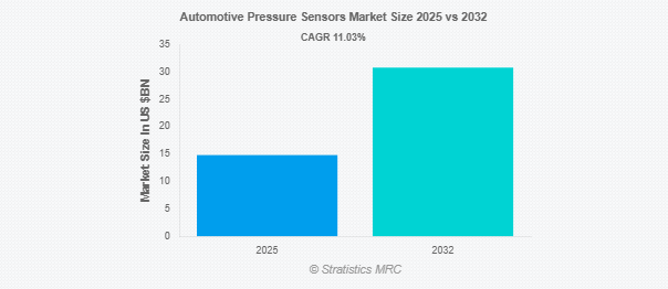 Stratistics MRCによると、自動車用圧力センサの世界市場は2025年に148.1億ドルを占め、予測期間中の年平均成長率は11.03%で、2032年には307.9億ドルに達する見込みです。自動車用圧力センサーは、タイヤ、燃料システム、エンジンのさまざまな圧力レベルに関する重要な情報を追跡・伝達するため、現代の自動車には不可欠なコンポーネントです。圧力の変動を特定し、車両の電子制御ユニット(ECU)に通知して必要な調整を行うことで、これらのセンサーは最適な性能、安全性、効率を保証します。マニホールド絶対圧(MAP)、燃料レール圧、油圧モニタリングが代表的な用途です。さらに、電気自動車やハイブリッド車の普及により、正確で信頼性の高い圧力センシングの必要性が高まっており、センサーの耐久性、小型化、先進運転支援システム(ADAS)との統合の進歩に拍車がかかっています。