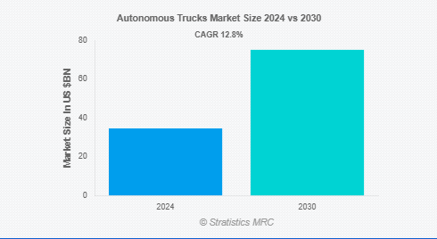 Stratistics MRCによると、自律走行トラックの世界市場は2024年に345億9000万ドルを占め、予測期間中の年平均成長率は12.8%で、2030年には751億7000万ドルに達する見込みです。自律走行トラックは、人工知能(AI)、センサー、カメラ、レーダー、および高度なソフトウェアを使用して、人間の介入を最小限またはゼロで道路をナビゲートする自動運転の商用車です。LiDAR、GPS、機械学習のような技術を使用して、障害物を検出し、交通信号を解釈し、ルートを最適化します。ロジスティクス、貨物輸送、サプライチェーン管理などの業界において、効率を高め、人為的ミスを減らし、輸送コストを削減し、最終的には長距離トラック輸送や配送サービスに革命をもたらすことを目指しています。