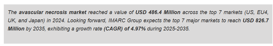 無血管性壊死治療市場は、2024年に主要7市場(アメリカ、EU4、英国、日本)において 4億8640万ドルの規模に達しました。