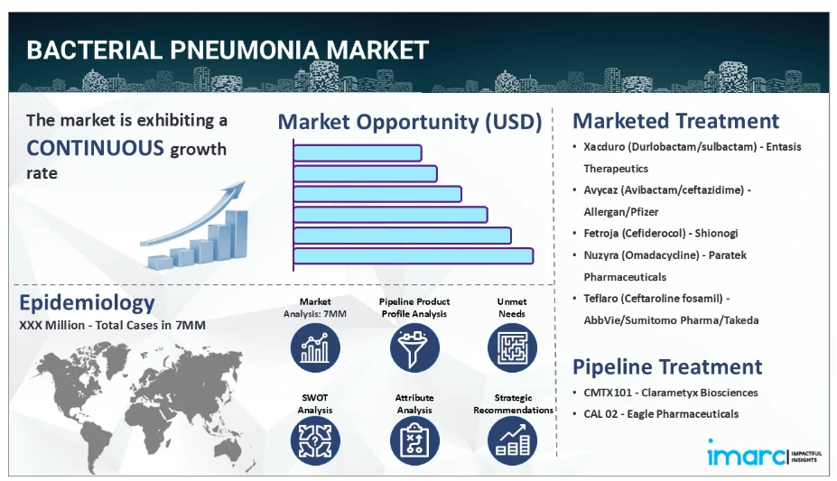 IMARC Groupの新報告書は、米国、EU4(ドイツ、スペイン、イタリア、フランス)、英国、日本における細菌性肺炎市場について包括的な分析を提供しております。これには、治療実践、市場流通中および開発中の薬剤、個別療法のシェア、主要7市場における市場動向、主要企業とその薬剤の市場実績などが含まれます。また、主要7市場における現在および将来の患者層についても記載されております。本報告書によれば、米国は細菌性肺炎の患者数が最も多く、治療市場としても最大規模を占めています。さらに、現行の治療実践/アルゴリズム、市場推進要因、課題、機会、償還状況、未充足医療ニーズなども本報告書で提供されています。本レポートは、製造業者、投資家、ビジネス戦略担当者、研究者、コンサルタント、ならびに細菌性肺炎市場に関与している、または参入を計画している全ての方にとって必読の資料です。