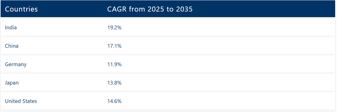 国別 2025年から2035年までのCAGRインド 19.2%中国 17.1%ドイツ 11.9%日本 13.8%米国 14.6%
