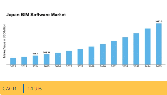 日本のBIMソフトウェア市場は、技術進歩、インフラ投資の増加、効率性への需要に牽引され、2024年から2035年にかけて14.9%のCAGRで成長すると予測される。