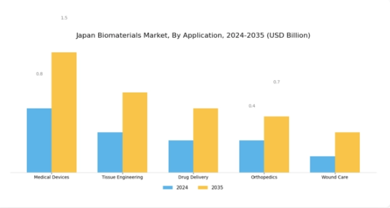 日本のバイオマテリアル市場は、特に医療機器、組織工学、薬物送達、整形外科、創傷ケアといった重要分野を含む応用分野において顕著な進展を見せている。これらの各分野は、新興技術、高齢化、医療費増加に牽引され、大きな成長機会を秘めている。医療機器はバイオマテリアル分野の基盤であり、革新と患者アウトカムを向上させる製品へのバイオマテリアル統合により堅調さを維持している。