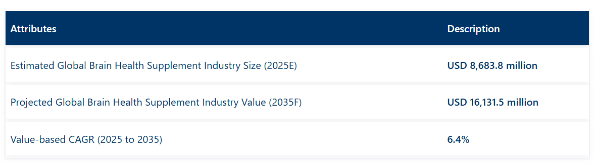 世界の脳健康サプリメント市場は、2025年の86億8380万米ドルから、2035年までに161億3150万米ドルへと成長すると予測されております。この著しい成長は、今後数年間における年平均成長率(CAGR)6.4%を反映したものでございます。