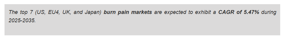 上位7市場(アメリカ、EU4、英国、日本)の火傷痛治療市場は、2025年から2035年にかけて年平均成長率(CAGR)5.47%で成長すると予測されております。