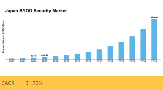 日本のBYODセキュリティ市場は、モバイルデバイス利用の増加と進化するセキュリティ脅威を背景に、2024年から2035年にかけて年平均成長率(CAGR)31.72%で成長すると予測される。