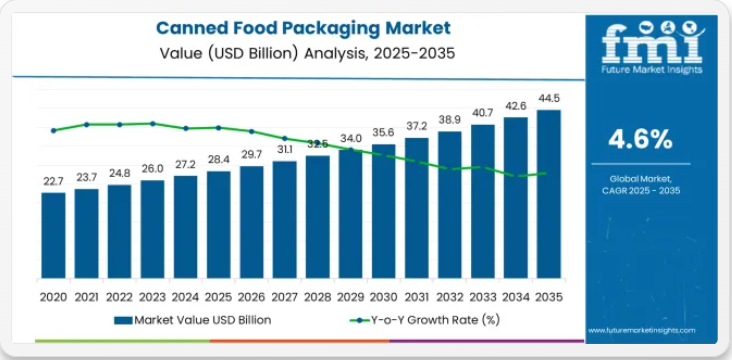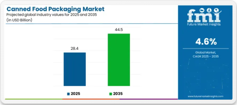 世界の缶詰食品包装市場は、2025年に284億米ドルと評価され、2035年までに445億米ドルに達すると予測されており、予測期間中に161億米ドルの絶対的な増加を示しています。これは総成長率57.4%に相当し、2025年から2035年にかけて市場は年平均成長率(CAGR)4.6%で拡大すると予測される。FMIの食品消費動向と製品革新に関する実証ベースの報告書によると、新興市場における保存性食品ソリューションの需要増加、都市部人口における便利な即席食形式の普及拡大、緊急時対応用途や国際食品流通ネットワークにおける長期保存食品システムの選好高まりを背景に、同期間中の市場規模全体は約1.57倍に成長すると予測される。最終更新日: 2025年10月15日缶詰包装市場 基本統計缶詰包装市場規模(2025年見込み): 284億米ドル缶詰包装市場規模(2035年予測): 445億米ドル缶詰包装市場予測 CAGR: 4.6%缶詰食品包装市場の主要用途:野菜・果物(36.5%)缶詰食品包装市場の主要成長地域:アジア太平洋、北米、欧州缶詰食品包装市場の主要企業:クラウン・ホールディングス社、ボール・コーポレーション、アーダ・グループ、シルガン・ホールディングス、カンパックS.A.、東洋製罐グループ