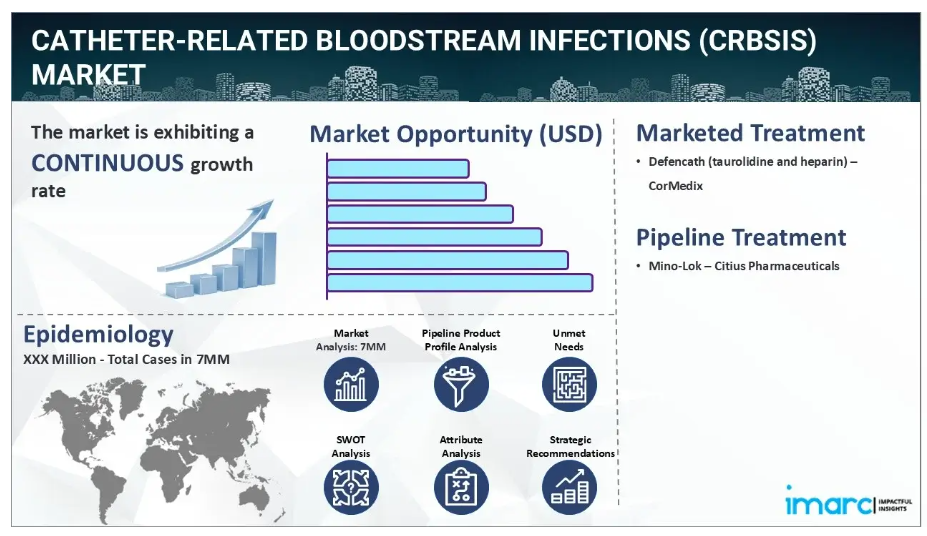 IMARC社の新報告書「カテーテル関連血流感染症(CRBSI)市場規模、疫学、市場内医薬品売上高、開発中の治療法、および地域別展望 2025-2035」において、カテーテル関連血流感染症(CRBSI)市場が包括的に分析されております。カテーテル関連血流感染(CRBSI)とは、血管内カテーテル(通常は動脈カテーテルまたは中心静脈カテーテル)の存在に起因する一次的な血流感染を指します。これは一般的に院内感染性菌血症によって引き起こされ、中心静脈カテーテル挿入に関連する最も頻度が高く、致死的で、かつ費用のかかる問題の一つです。カテーテル関連血流感染で一般的に観察される徴候・症状には、カテーテル挿入部位の炎症や化膿、ならびにカテーテル以外の明らかな感染源がないにもかかわらず急性に発症する発熱、悪寒、低血圧などが含まれます。血管カテーテル関連感染の診断検査は、高い疑いがある場合に実施可能です。カテーテル関連感染は、定量的血液培養を用いて最も正確に診断できます。