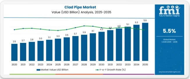 世界のクラッドパイプ市場は2025年に33億米ドルと評価され、2035年までに56億米ドルに達すると予測されており、予測期間中に21億米ドルの絶対増加を記録する見込みです。これは総成長過程66.3%に相当し、2025年から2035年にかけて市場は年平均成長率(CAGR)5.5%で拡大すると予測される。同期間における市場規模全体の成長率は約1.7倍に達すると予測されており、これは海洋石油・ガス探査活動の増加、耐食性材料への需要拡大、多様な産業用配管用途における先進的接合技術の採用拡大に支えられています。