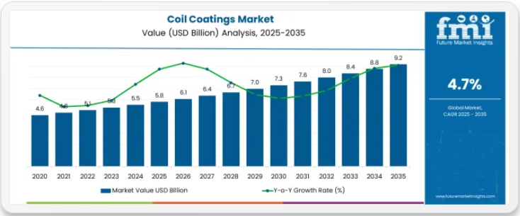 市場規模は、建築ファサードや屋根システム向けの建設活動の増加、現場塗装の必要性を低減するプレフィニッシュ金属製品の採用拡大、建築外装・輸送・家電製造用途における耐久性・耐食性コーティングの需要増を背景に、同期間中に約1.59倍の成長が見込まれる。