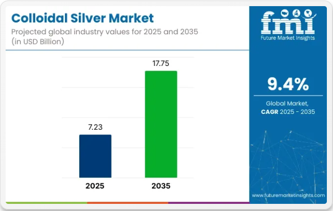 世界のコロイダルシルバー市場は2025年に72億3000万米ドルと評価され、2035年までに177億5000万米ドルに達すると予測されており、予測期間中のCAGRは9.4%を示しています。