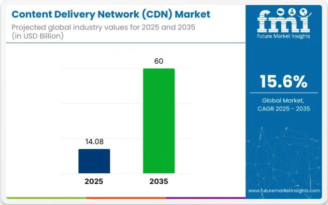 世界のコンテンツ配信ネットワーク(CDN)市場は、2025年に140億8000万米ドルの規模となり、2035年までに600億米ドルに達すると予測されており、予測期間において15.6%という堅調なCAGR(年平均成長率)を示しています。この成長過程は、モバイルおよびデスクトッププラットフォームにおけるデータ消費量、動画ストリーミング、ゲーム、リアルタイムコンテンツ配信の急激な増加によって牽引されている。