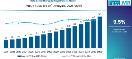 データセンターのマイクログリッド向けディーゼル発電機の世界市場は、戦略的な進化の段階に入っており、2026年の21億5,000万米ドルから2036年までに53億3,000万米ドルへと成長し、年平均成長率(CAGR)9.5%で拡大すると予測されています。