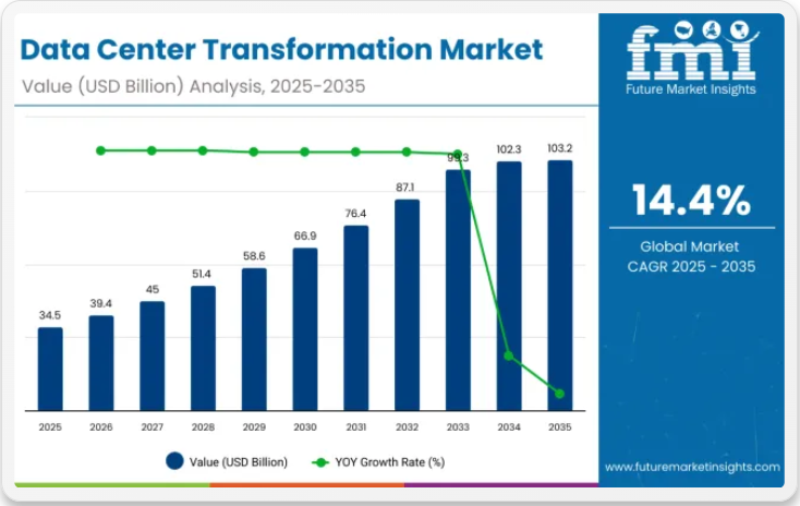 世界のデータセンター変革市場:世界のデータセンター変革市場は、2025年の345億6,000万米ドルから2035年までに1,032億6,000万米ドルへと拡大し、この期間中に14.4%という堅調なCAGRで成長すると予測