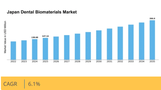 これは、日本でデジタル歯科医療と患者ソリューションの強化への関心が高まっていることと一致している。過去2年間、日本の歯科用生体材料市場の成長は、骨移植代替材や歯科用接着剤の需要急増によって特徴づけられ、口腔衛生意識の高まりや技術進歩などの要因により評価額が上昇した。全体として、これらの動きは日本の歯科用生体材料分野がダイナミックに進化していることを示している。
