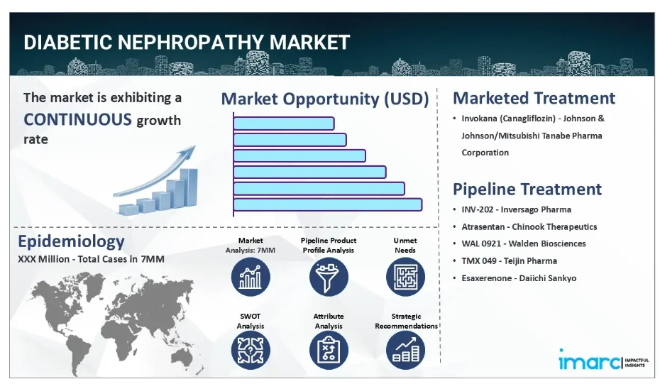 高血圧や糖尿病の有病率の増加は、血管やその他の腎細胞に直接損傷を与えるため、糖尿病性腎症市場の主な推進要因となっています。これに加え、肥満、高コレステロール血症、喫煙、家族歴など、数多くの関連リスク要因の発生率上昇も市場成長を後押ししています。さらに、高血圧の正常化や血糖値の低下を助けるアンジオテンシン2受容体拮抗薬やグルカゴン様ペプチド-1(GLP-1)受容体作動薬など、効果的な薬剤の利用拡大も、もう一つの重要な成長促進要因として作用しています。加えて、様々な政府機関や非政府組織が、糖尿病性腎症の患者に対する行動カウンセリングを含む教育プログラムへの認知向上とアクセス改善に向けた取り組みを進めています。これにより、市場の成長も促進されております。加えて、透析を回避し、インスリン注射の必要性をなくし、患者の疾患進行リスクを低減する点から、間葉系幹細胞療法の治療法としての人気が高まっており、今後数年間で糖尿病性腎症市場を牽引することが期待されております。