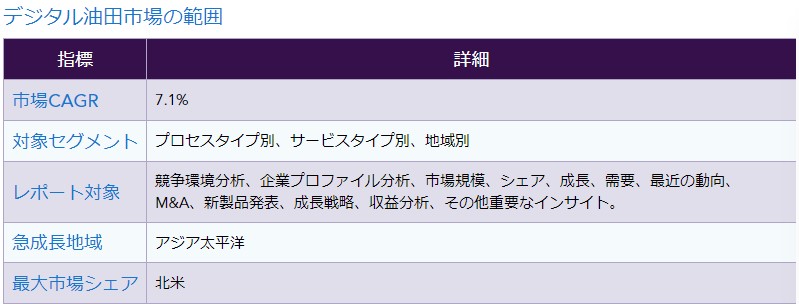 世界のデジタル油田市場は、プロセスの種類、サービスの種類、地域によって区分されている。