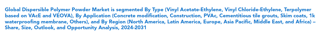 種類別では、酢酸ビニル-エチレン、塩化ビニル-エチレン、VAcEとVEOVAをベースとしたターポリマーに市場を細分化。市場は、コンクリート改質、建築、PVAc、1k防水膜、その他に細分化されます。