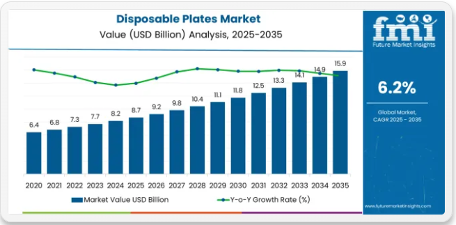 世界の使い捨てプレート市場:使い捨てプレート市場は、2025年の87億米ドルから2035年までに159億米ドルへ、年平均成長率(CAGR)6.2%で成長すると予測