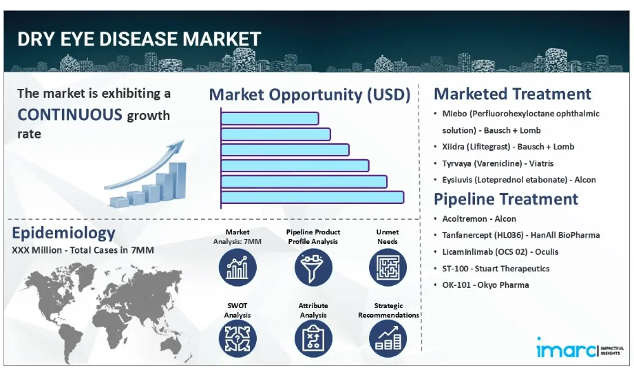 IMARC Groupの新報告書は、米国、EU4(ドイツ、スペイン、イタリア、フランス)、英国、日本におけるドライアイ疾患市場について包括的な分析を提供します。これには、治療実践、市場流通中および開発中の薬剤、個別療法のシェア、7大市場における市場動向、主要企業とその薬剤の市場実績などが含まれます。本レポートではさらに、7大市場における現在および将来の患者層についても提示しております。
