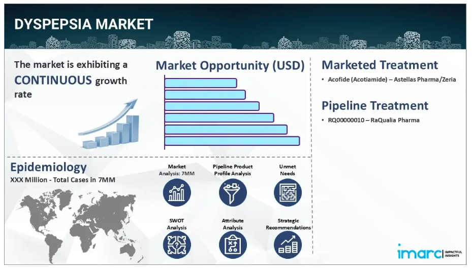 IMARC Groupの新報告書は、米国、EU4(ドイツ、スペイン、イタリア、フランス)、英国、日本における消化不良市場について包括的な分析を提供しております。これには、治療実践、市場流通中および開発中の薬剤、個別療法のシェア、主要7市場における市場動向、主要企業とその薬剤の市場実績などが含まれます。また、主要7市場における現在および将来の患者数についても記載されております。本報告書によれば、米国は消化不良の患者数が最も多く、治療市場としても最大規模を占めています。さらに、現在の治療実践/アルゴリズム、市場推進要因、課題、機会、償還シナリオ、未充足医療ニーズなども本報告書で提供されています。本報告書は、メーカー、投資家、ビジネス戦略家、研究者、コンサルタント、および消化不良市場に何らかの形で関与している、あるいは参入を計画している全ての方にとって必読の資料です。
