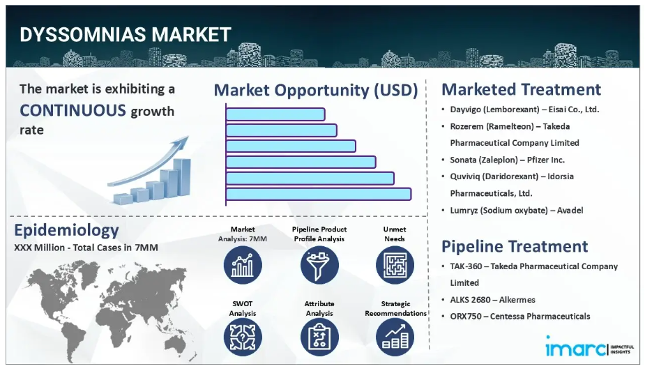 IMARC Groupの新報告書は、米国、EU4(ドイツ、スペイン、イタリア、フランス)、英国、日本における不眠症市場の詳細な分析を提供します。これには、治療実践、市場流通中および開発中の薬剤、個別療法のシェア、7大市場における市場動向、主要企業とその薬剤の市場実績などが含まれます。本レポートではさらに、7大市場における現在および将来の患者層についても提示しています。レポートによれば、米国は睡眠障害の患者数が最も多く、その治療市場も最大規模を占めています。さらに、現在の治療実践/アルゴリズム、市場推進要因、課題、機会、償還シナリオ、未充足医療ニーズなども本報告書に記載されています。本報告書は、製造業者、投資家、ビジネス戦略家、研究者、コンサルタント、および不眠症市場に関与している、あるいは参入を計画している全ての方にとって必読の資料です。