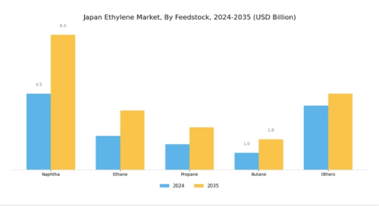 日本エチレン市場の原料セグメントは、エチレン生産の全体的な効率性と持続可能性を決定する上で極めて重要な役割を果たす。このセグメントには主にナフサ、エタン、プロパン、ブタンなどの各種炭化水素原料が含まれ、それぞれが生産プロセスに異なる貢献をしている。日本では、入手可能性と汎用性から、ナフサが歴史的にエチレン生産の主要原料となっている。