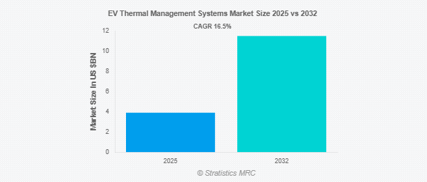 Stratistics MRCによると、EV熱管理システムの世界市場は2025年に39億ドルを占め、予測期間中の年平均成長率は16.5%で、2032年には115億ドルに達する見込みです。電気自動車(EV)熱管理システムは、バッテリーパック、パワーエレクトロニクス、電気モーターなど、電気自動車のさまざまなコンポーネントの温度を調整するために設計された特殊なシステムです。これらのシステムは、最適な動作温度を確保し、性能を向上させ、部品の寿命を延ばし、安全性を維持します。熱管理には、空冷、液冷、相変化材料などの方法が用いられます。効率的な熱管理は、オーバーヒートの防止、エネルギー効率の向上、安定した走行距離の確保において極めて重要です。EVの普及が進むにつれ、高度な熱管理ソリューションは、急速充電、高性能運転、多様な環境条件下でのバッテリーの耐久性をサポートするために不可欠になっています。