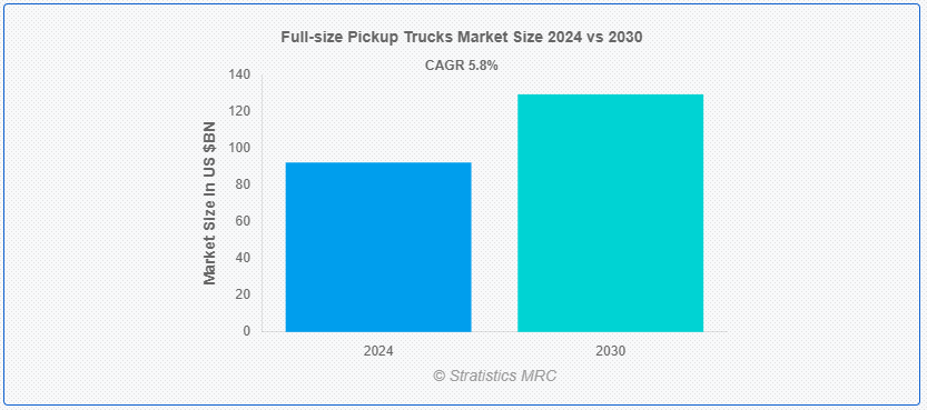 Stratistics MRCによると、フルサイズピックアップトラックの世界市場は2024年に922億ドルを占め、予測期間中の年平均成長率は5.8%で、2030年には1,293億ドルに達する見込みである。 フルサイズピックアップトラックは、頑丈なフレーム、パワフルなエンジン、大きな牽引力と積載量を特徴とする、ヘビーデューティな作業用に設計された大型で多用途な自動車である。 個人用としても商業用としても人気があり、広々とした室内空間、先進の安全装備とハイテク機能、さまざまな荷台と運転席の構成を備えています。 これらのトラックは、物資の輸送やオフロード走行に最適で、建設、農業、その他要求の厳しい産業で信頼できる主力車として活躍している;