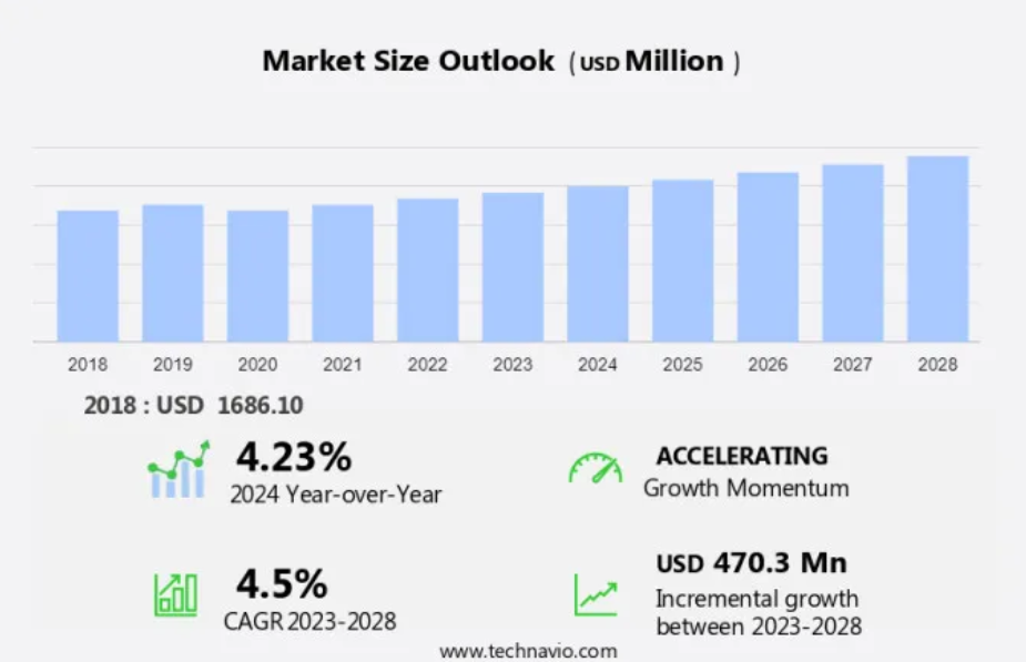 ギアポンプ市場規模は、2023年から2028年の間にCAGR 4.5%で4億7030万米ドル増加すると予測されている。農業の機械化と農業機械産業の拡大により、世界市場は著しい成長を遂げている。新興経済圏における化学製造施設への投資の増加も、市場の成長に寄与している。しかし、主要消費国である中国の鉱業の縮小は市場にとっての課題となっています。さらに、エネルギー効率と費用対効果の高いポンプソリューションに対する需要の高まりが、市場における技術革新と競争を促進しています。全体として、これらの傾向と課題に牽引され、市場は着実に成長すると予測されています。