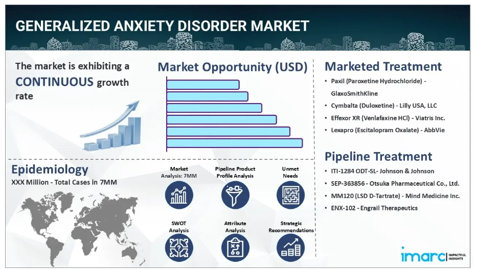 IMARC Groupの新報告書は、米国、EU4(ドイツ、スペイン、イタリア、フランス)、英国、日本における全般性不安障害市場を包括的に分析しております。これには、治療実践、市場流通中および開発中の薬剤、個別療法のシェア、主要7市場における市場動向、主要企業とその薬剤の市場実績などが含まれます。また、主要7市場における現在および将来の患者数についても提示しております。本報告書によれば、米国は全般性不安障害の患者数が最も多く、治療市場としても最大規模を占めています。さらに、現行の治療実践/アルゴリズム、市場推進要因、課題、機会、償還状況、未充足医療ニーズなども本報告書で提供されています。本レポートは、製造業者、投資家、ビジネス戦略家、研究者、コンサルタント、および全般性不安障害市場に関与している、あるいは参入を計画している全ての方にとって必読の資料です。