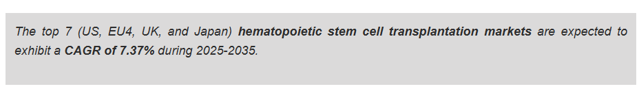 主要7市場(アメリカ、EU4、英国、日本)の造血幹細胞移植市場は、2025年から2035年にかけて年平均成長率(CAGR)7.37%で成長すると予測されております。