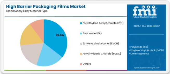 ポリエチレンテレフタレート(PET)セグメントは、2025年の高バリア包装フィルム市場において35.5%を占めると予測され、主要素材カテゴリーとしての地位を再確認しています。食品メーカーや製薬会社は、バリアコーティングとの組み合わせによる優れた機械的強度、優れた光学透明性、およびレディミール包装からブリスターパック蓋に至る用途での熱安定性から、PETベースのバリアフィルムの利用を増加させている。PETバリアフィルム技術の高度なコーティング適合性と一貫した寸法安定性は、高速包装工程における信頼性の高いバリア性能に対する業界の要求を直接満たすものである。