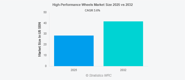 Stratistics MRCによると、高性能ホイールの世界市場は2025年に285億ドルを占め、予測期間中の年平均成長率は5.6%で、2032年には417億ドルに達する見込みです。高性能ホイールは、自動車のハンドリング、スピード、ブレーキ効率を高めるために設計された精密工学部品です。通常、アルミニウムやマグネシウムなどの軽量合金で作られ、バネ下質量を減らし、熱放散を改善し、より優れたエアロダイナミクスをサポートします。これらのホイールは、その強度、耐久性、美しさから、スポーツカーや高級車に好まれています。鍛造または鋳造による高度な構造により、厳しい走行条件下でも最適な性能を発揮し、燃費、安定性、全体的なドライビングダイナミクスの向上に貢献します。