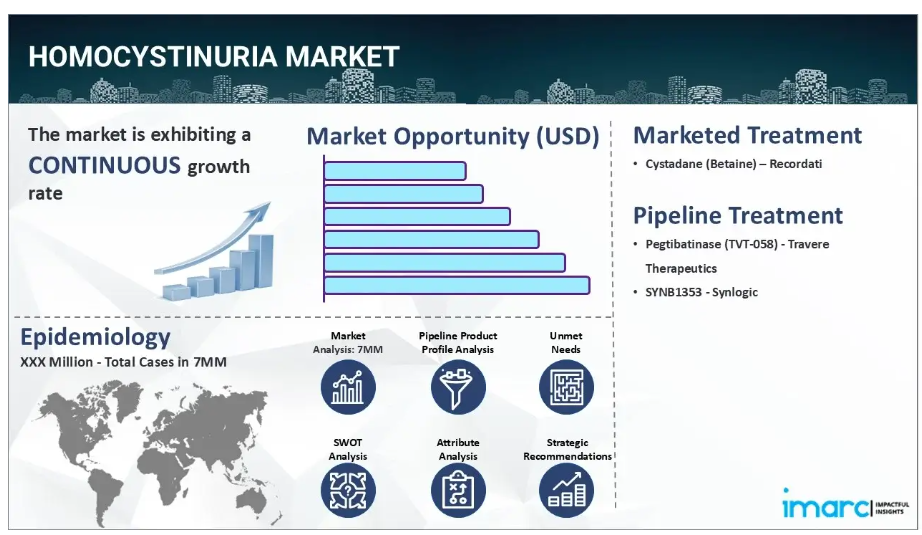 IMARC Groupの新報告書は、米国、EU4(ドイツ、スペイン、イタリア、フランス)、英国、日本におけるホモシステイン尿症市場を包括的に分析しております。これには、治療実践、市場流通中および開発中の薬剤、個別療法のシェア、主要7市場における市場実績、主要企業とその薬剤の市場実績などが含まれます。また、主要7市場における現在および将来の患者数についても提示しております。本報告書によれば、米国はホモシステイン尿症患者数が最も多く、治療市場規模も最大となっています。さらに、現在の治療実践/アルゴリズム、市場推進要因、課題、機会、償還シナリオ、未充足医療ニーズなども本報告書に記載されています。本報告書は、製造業者、投資家、ビジネス戦略家、研究者、コンサルタント、およびホモシスチン尿症市場に関与している、あるいは参入を計画している全ての方にとって必読の資料です。