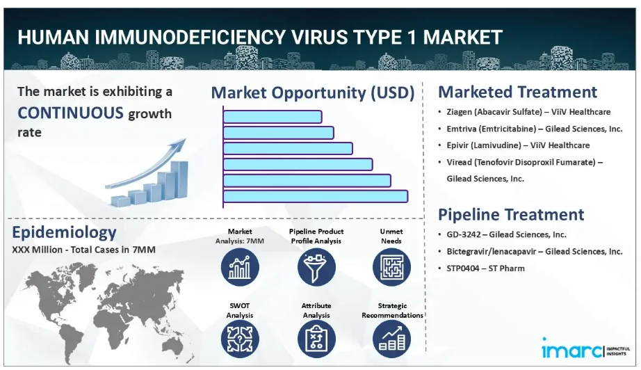 静脈内薬物使用の増加(針や注射器の共有を伴い、ウイルス伝播リスクを高める)が、ヒト免疫不全ウイルス1型(HIV-1)市場の主な推進要因となっております。加えて、無防備な性交の増加(病原体が膣、直腸、陰茎、口の粘膜にある微小な傷や裂傷、擦過傷を通じて血流に侵入する可能性)も、市場にとって前向きな見通しを生み出しております。さらに、ラルテグラビル、ドルテグラビル、エルビテグラビルなどのインテグラーゼ鎖転移阻害剤が、ウイルスDNAの宿主遺伝物質への組み込みを防止するのに役立つことから広く採用されていることも、市場の成長をさらに後押ししています。これに伴い、リトナビルやコビシスタットなどの薬物動態増強剤を他の抗レトロウイルス薬と併用し、治療効果を向上させる応用が拡大していることも、成長を促す重要な要因となっています。さらに、病原体に対する免疫応答を刺激し、感染を制御して疾患進行を遅らせることを目的とした治療用HIVワクチンの人気が高まっていることも、予測期間中のヒト免疫不全ウイルス1型(HIV-1)市場を牽引すると見込まれます。