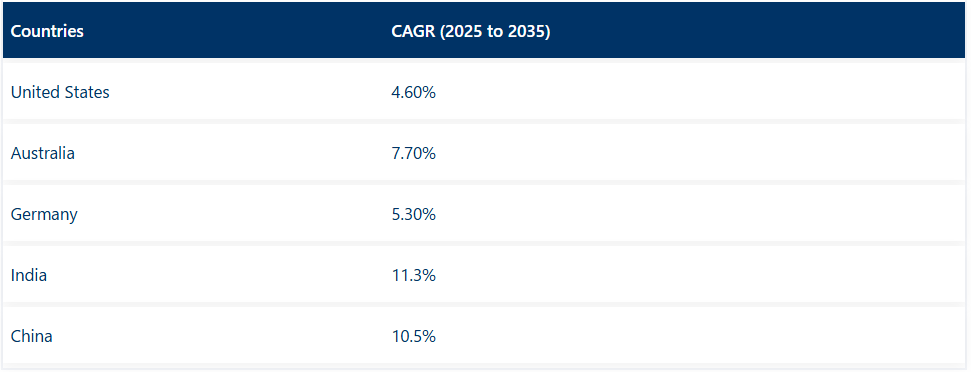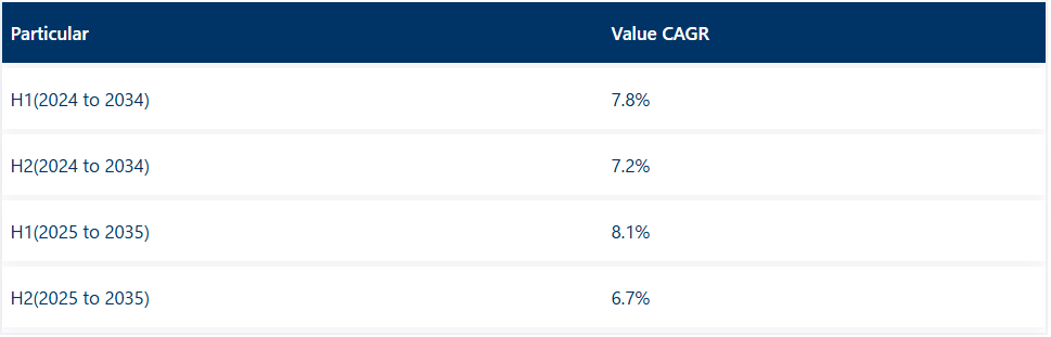 CAGRは変動傾向を示し、H1(2024~2034年)からH2(2024~2034年)にかけて78ベーシスポイント(BPS)増加しており、後半期の成長過程が強まることを示唆しています。さらに、H1(2025~2035年)における81ベーシスポイントの微増は、一時的な市場安定化または外部成長を示唆しています。