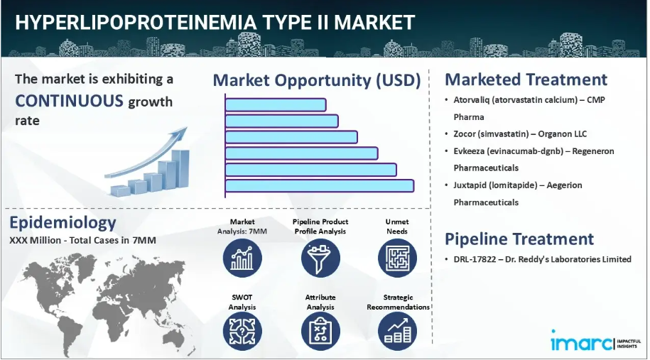 IMARC Group の新報告書は、米国、EU4(ドイツ、スペイン、イタリア、フランス)、英国、および日本における高リポタンパク血症 II 種類市場について、包括的な分析を提供しています。これには、治療実践、市場流通中および開発中の薬剤、個別療法のシェア、7大市場における市場動向、主要企業とその薬剤の市場実績などが含まれます。本レポートではさらに、7大市場における現在および将来の患者数についても提示しております。