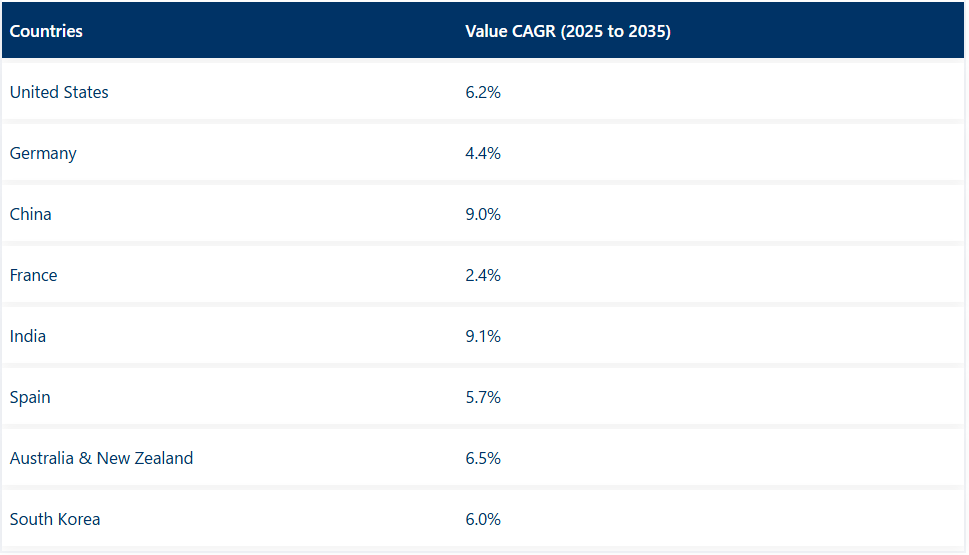 北米では米国が2035年まで高い市場シェアを維持し、引き続き主導的立場にあると予測される。南アジア・太平洋地域では、インドが2035年までに年平均成長率(CAGR)9.1%を記録すると見込まれる。