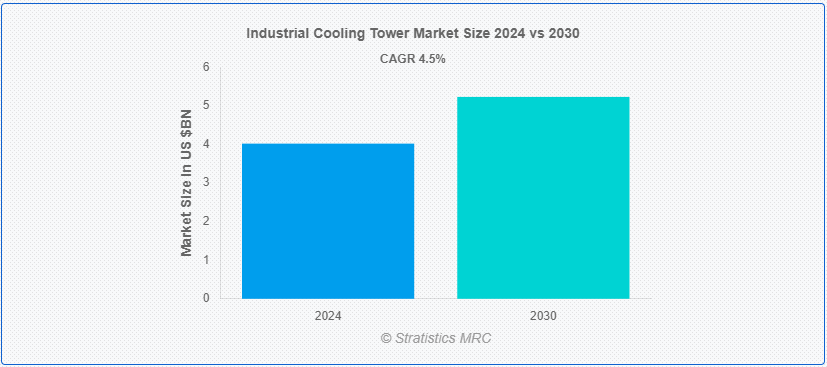 Stratistics MRCによると、産業用冷却塔の世界市場は2024年に40.2億ドルを占め、予測期間中の年平均成長率は4.5%で、2030年には52.3億ドルに達すると予測されている。 産業用冷却塔は、製造工程や機械で発生する余分な熱を放散するために様々な産業で使用される特殊な構造物である。 蒸発または対流によって高温のプロセス水から大気へ熱を移動させ、循環水の温度を下げることで機能する。 これは通常、バッフルまたは充填媒体のシステム上に水を噴霧し、空気と接触させることで達成される。 産業機器やプロセスの最適な運転条件を維持するのに役立ちます。