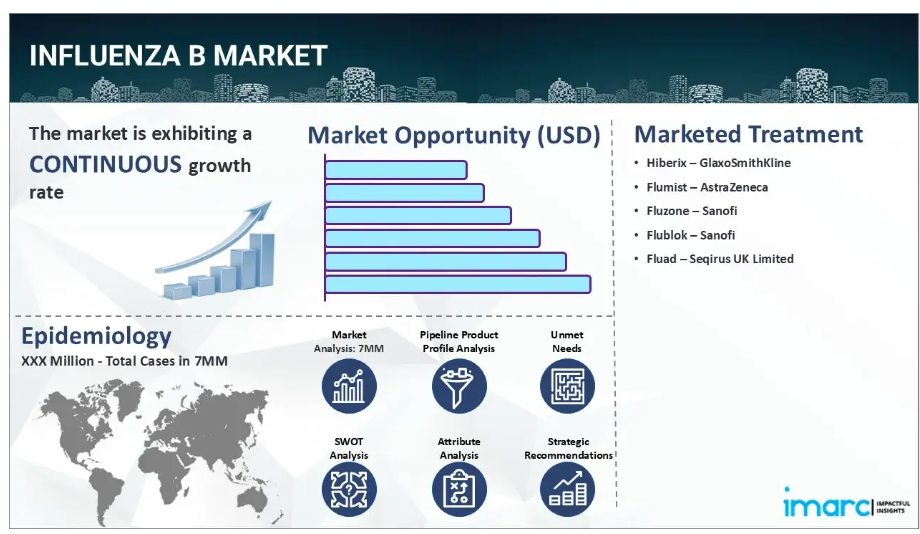 IMARC Groupの新報告書は、米国、EU4(ドイツ、スペイン、イタリア、フランス)、英国、日本におけるインフルエンザB市場を網羅的に分析しております。これには、治療実践、市場流通中および開発中の薬剤、個別療法のシェア、7大市場における市場動向、主要企業とその薬剤の市場実績などが含まれます。また、7大市場における現在および将来の患者数についても提示しております。本報告書によれば、米国はインフルエンザB型における最大の患者層を有し、その治療市場においても最大規模を占めています。さらに、現行の治療実践/アルゴリズム、市場推進要因、課題、機会、償還状況、未充足医療ニーズなども本報告書で提供されています。本レポートは、製造業者、投資家、ビジネス戦略担当者、研究者、コンサルタント、およびインフルエンザB市場に関与している、あるいは参入を計画している全ての方にとって必読の資料です。