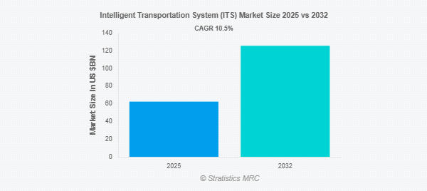 Stratistics MRCによると、世界の高度道路交通システム(ITS)市場は2025年に624.6億ドルを占め、予測期間中の年平均成長率は10.5%で、2032年には1,256.5億ドルに達する見込みです。交通の持続可能性、安全性、効率性を向上させるために、最先端の技術を交通網に統合することを高度道路交通システム(ITS)と呼びます。ITSは、センサー、通信システム、データ分析、自動化を利用して交通状況を監視し、交通インフラを管理し、ドライバーや乗客にリアルタイムで情報を提供します。ITSアプリケーションには、交通管理、スマート信号、自律走行車、公共交通機関の最適化、事故検知などが含まれ、渋滞の緩和、交通安全の向上、環境への影響の低減を目指しています。