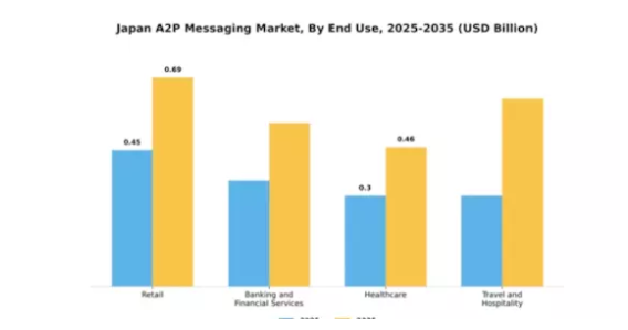 日本A2Pメッセージング市場規模推計と予測、産業別、2019-2035年(10億米ドル)
