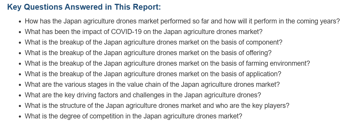 日本の農業用ドローン市場は、いくつかの主要な推進要因により、力強い成長を遂げています。まず、技術の進歩が農業におけるドローンの採用を飛躍的に進める上で重要な役割を果たしました。最先端のセンサー、AIアルゴリズム、バッテリー寿命の改善が統合されたことで、ドローンは現在、農作物の健康状態、土壌の状態、灌漑の必要性に関するきわめて正確なデータを農家に提供できるようになっています。その結果、生産性の向上と資源利用の最適化につながっています。さらに、地域人口の増加とそれに伴う食糧増産の必要性により、農家は革新的なソリューションを模索せざるを得なくなっています。農業用ドローンは、大規模農場を効率的に監視する手段を提供し、収穫量を増やし、無駄を減らす精密農業の実践を可能にします。さらに、気候変動と天候パターンへの予測不可能な影響により、農家は迅速な適応が不可欠となっています。ドローンはリアルタイムの監視能力を提供し、農家が変化する状況に迅速に対応し、損失を最小限に抑え、利益を最大化するのに役立ちます。さらに、食料安全保障と持続可能性の向上を目的とした政府や規制当局による数多くの支援政策やインセンティブが、予測期間中の日本の農業用ドローン市場を牽引すると予想されます。